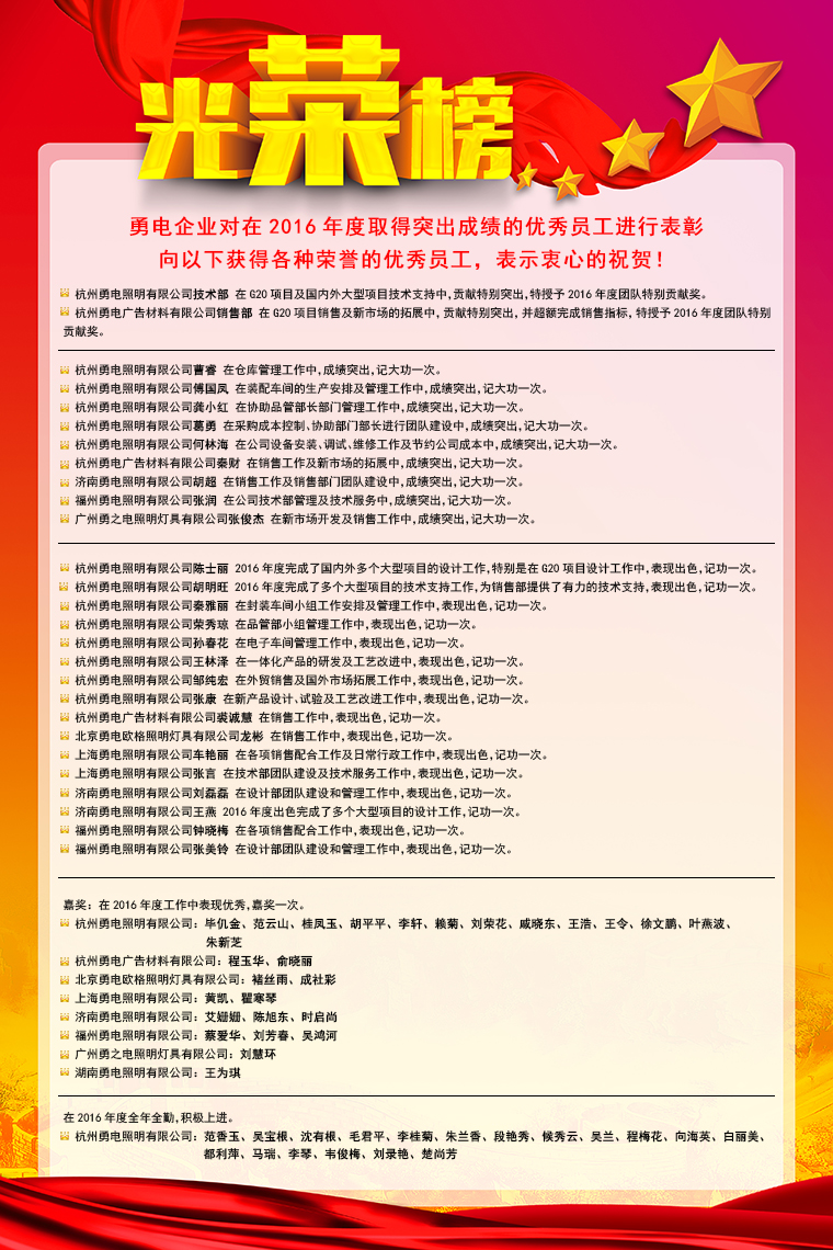 勇電照明2016年度優(yōu)秀員工榮譽(yù)榜出爐